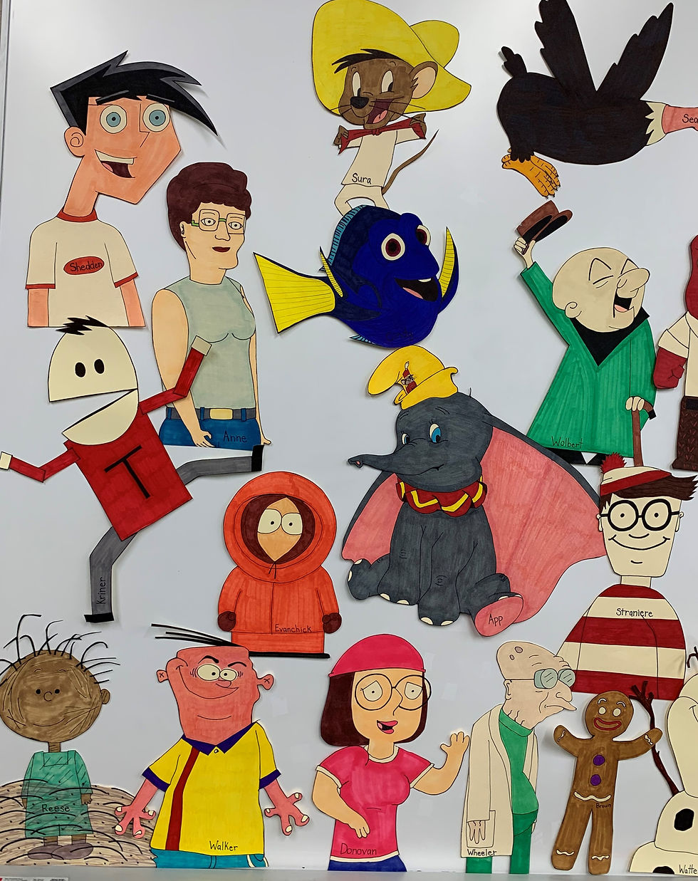 In between holidays, the board was looking too bare and boring. I decided to do an in between holiday board. The theme would be cartoon characters, and again... I would make one for each person at work.
